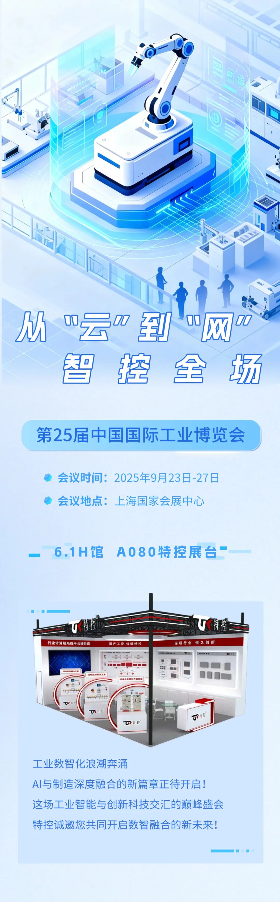 工業數智化浪潮奔涌,AI與制造深度融合的新篇章正待開啟!這場工業智能與創新科技交匯的巔峰盛會,特控誠邀您共同開啟數智融合的新未來!國家會展中心(上海)6.1H館 A080特控展臺歡迎各位親臨現場,與技術專家面對面交流觸摸工業AI的創新脈搏!也可通過直播云端參與,體驗別樣精彩!